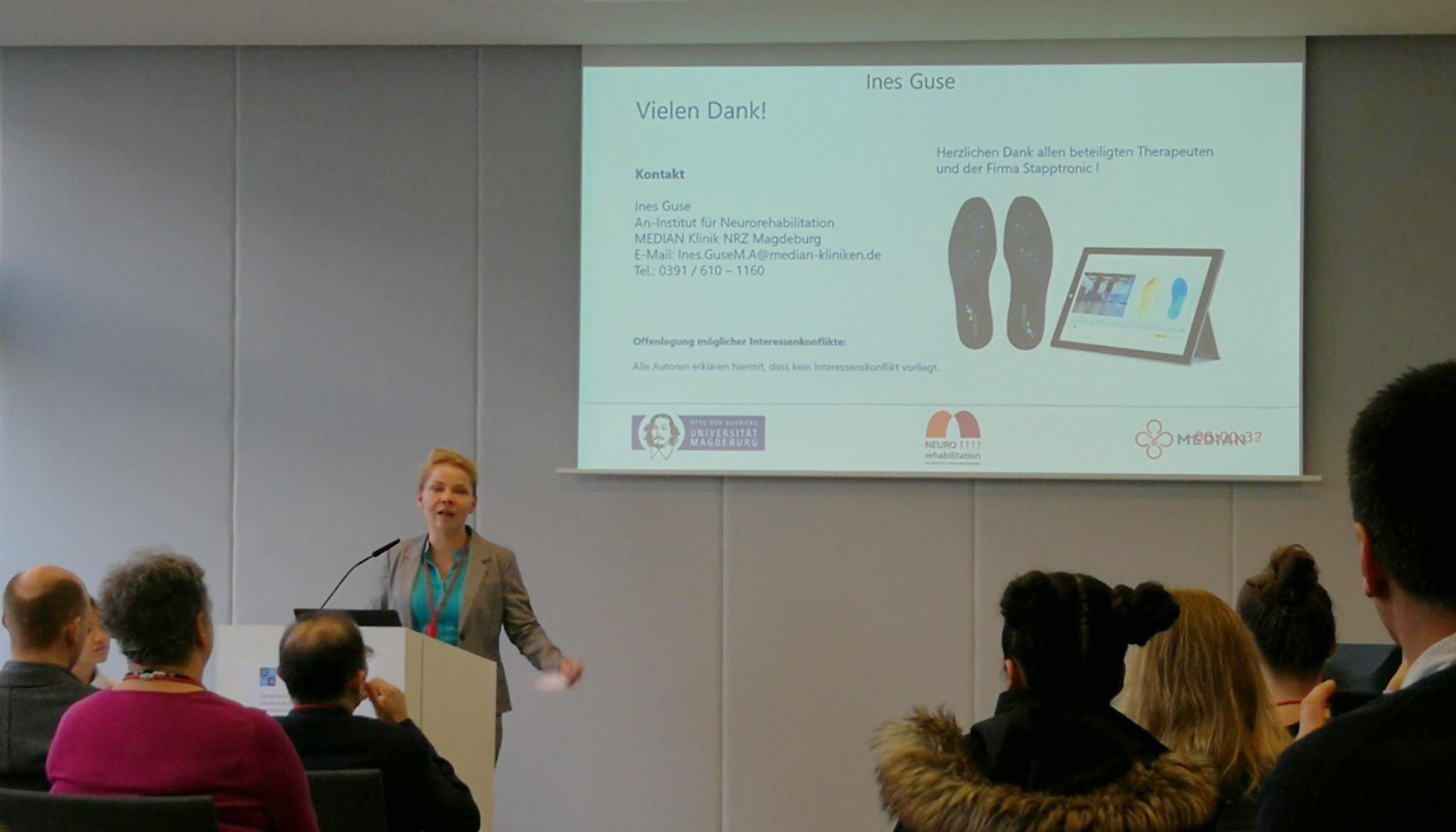 In dieser Studie ging es darum, herauszufinden wie unterstützend die Sohlensenorik in der neurologische Rehabilitation ist. Es scheint, als ob die Ergebnisse der Machbarkeitsstudie zum Einsatz der stappone Sensorsohlen vielversprechend sind. Die Studie wurde in Kooperation mit der MEDIAN Klinik NRZ Magdeburg und der MEDIAN Klinik Flechtingen durchgeführt und die Ergebnisse wurden auf der gemeinsamen Jahrestagung der Deutschen Gesellschaft für Neurorehabilitation in Augsburg im Dezember 2023 von Ines Guse, wissenschaftlicher Mitarbeiterin am An-Institut für Neurorehabilitation der Otto-von-Guericke Universität Magdeburg, vorgestellt.